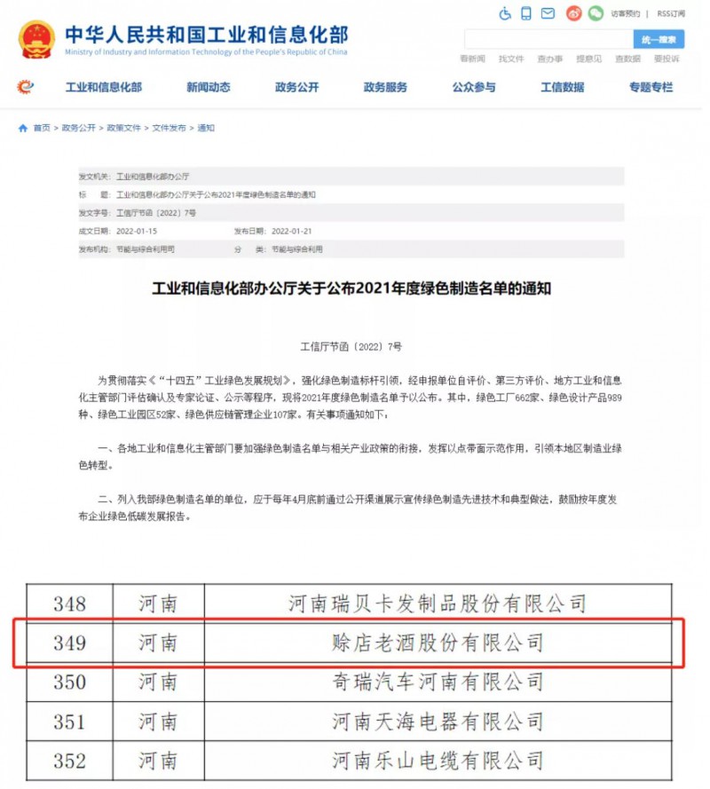 2022年1月21日,工业和信息化部办公厅于官网公布了2021年度绿色制造名单,在名单中,河南省仅一家酒企被授予“绿色工厂”荣誉称号,即赊店老酒股份有限公司。