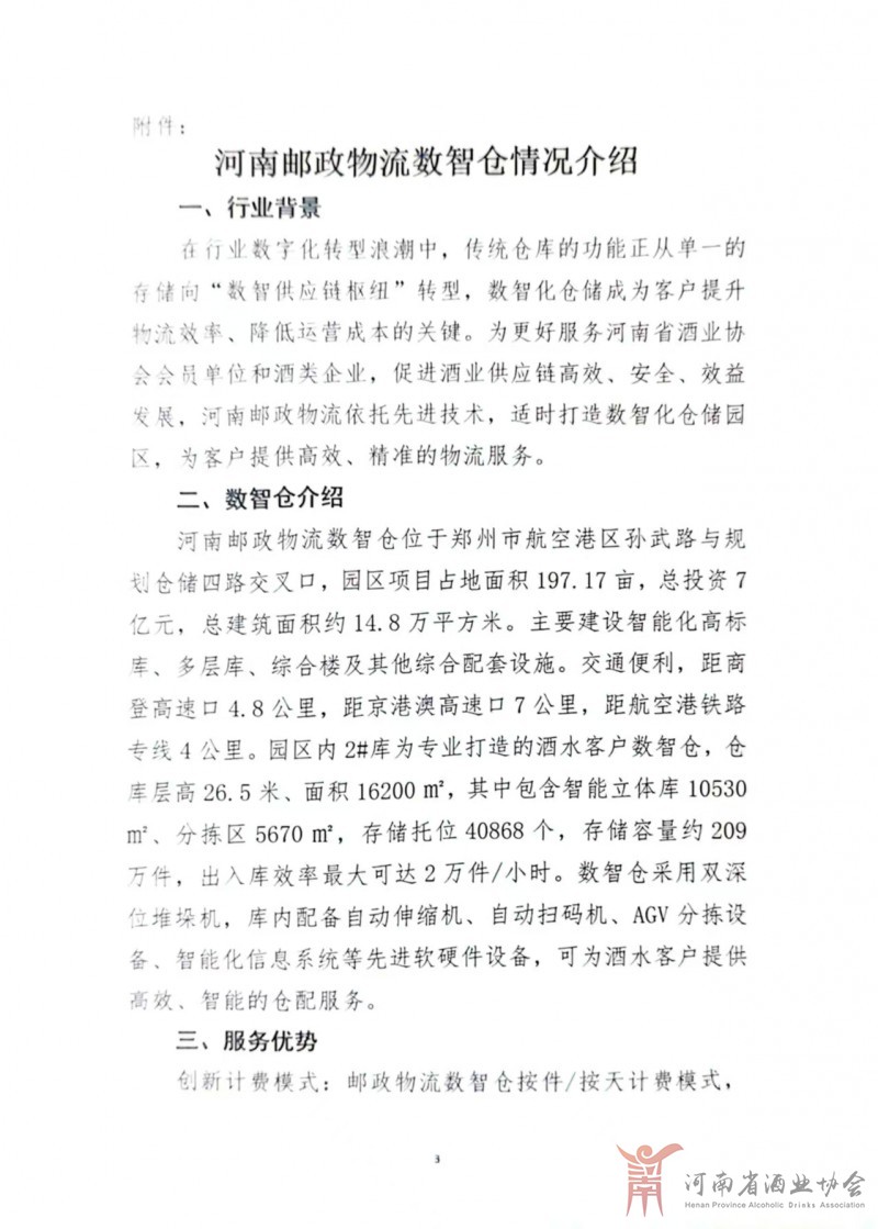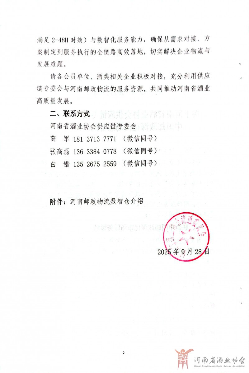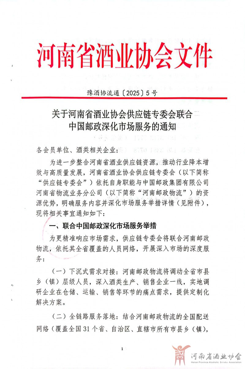 为进一步整合河南省酒业供应链资源,推动行业降本增效与高质量发展,河南省酒业协会供应链专委会(以下简称“供应链专委会”)依托自身职能与中国邮政集团有限公司河南省物流业务分公司(以下简称“河南邮政物流”)的资源优势,明确服务内容并深化市场服务举措详情(见附件),现将相关事宜通知如下: