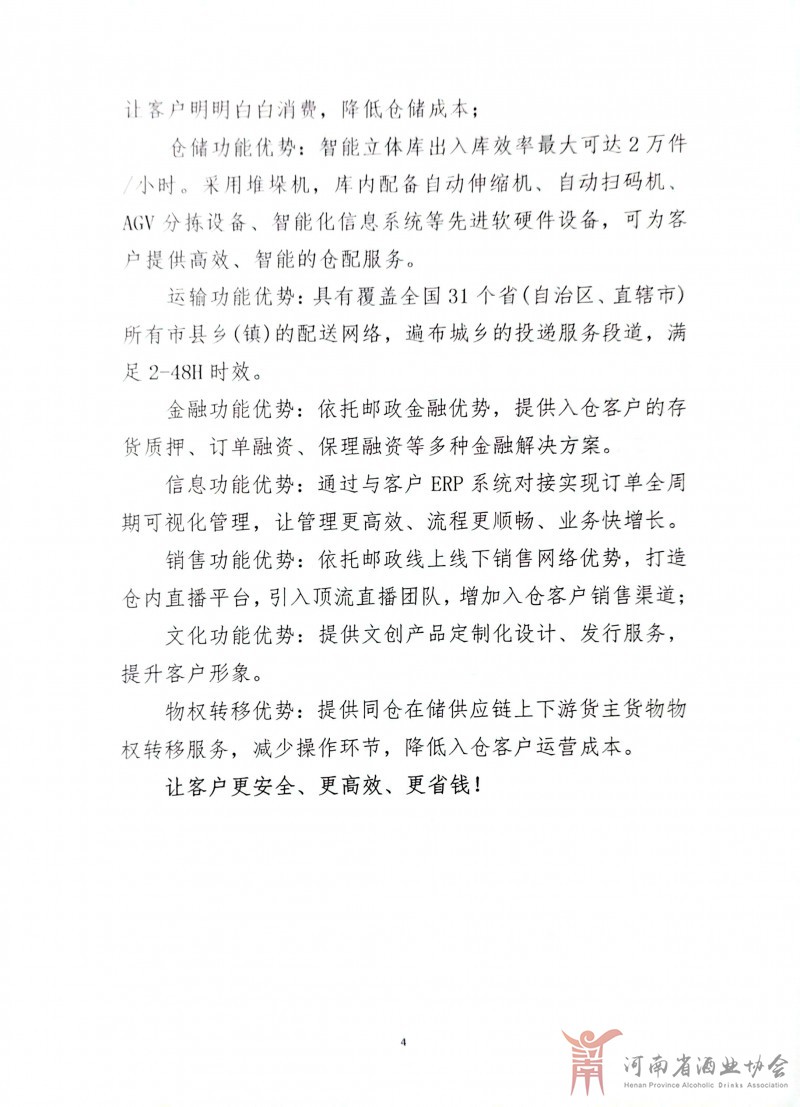 请各会员单位、酒类相关企业积极对接,充分利用供应链专委会与河南邮政物流的服务资源,共同推动河南省酒业高质量发展。